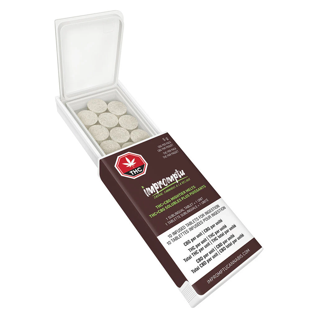 Impromptu THC+CBG Mightier Melts are sublingual tablets that deliver great aroma and taste. Made with state-of-the-art encapsulation technology. These dissolvable sublingual tablets each deliver 10 mg of THC and 10 mg of CBG. Discover the small, discreet and reusable package that you can easily carry in your pocket or purse with no extra bulk.